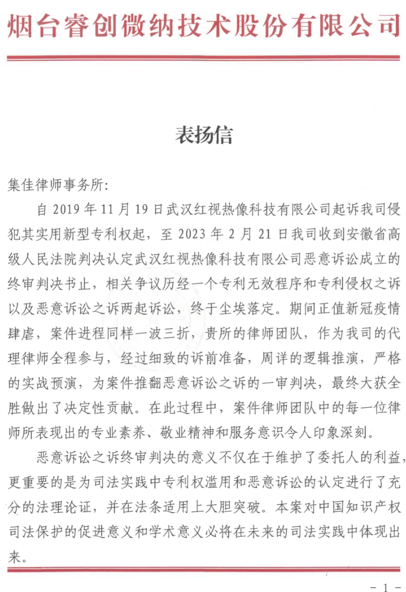 Unitalen Law Office assisted Raytron in winning the final victory in the patent infringement lawsuits and the malicious litigation case, which not only safeguarded Raytron's lawful rights and interests, but more importantly, restrained the abuse of right to sue by the unfair competitor for seeking unlawful interests, and made outstanding contributions to maintaining a good business environment.