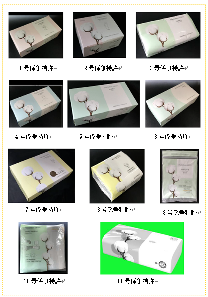 係爭専利はすべて柔らかい布製品の包裝用の箱および袋であり、相似する設(shè)計の要素と特徴を有する。意匠の出願日はそのうち10件が2017年6月5日、1件が2019年1月10日、すべての専利に色に対する保護は與えられていない。