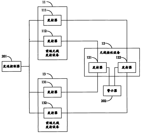 本實(shí)用新型實(shí)施例公開(kāi)了無(wú)線(xiàn)安防報(bào)警系統(tǒng)和裝置。其中,無(wú)線(xiàn)安防報(bào)警系統(tǒng)包括前端無(wú)線(xiàn)發(fā)射設(shè)備和無(wú)線(xiàn)接收設(shè)備,前端無(wú)線(xiàn)發(fā)射設(shè)備包括多個(gè)在發(fā)生警情時(shí)發(fā)送報(bào)警信號(hào)的發(fā)射器,任一發(fā)射器所發(fā)送報(bào)警信號(hào)的頻率與其他發(fā)射器所發(fā)送報(bào)警信號(hào)的頻率處于不同頻段;無(wú)線(xiàn)接收設(shè)備包括與多個(gè)發(fā)射器一一對(duì)應(yīng)的多個(gè)接收器。可見(jiàn),本實(shí)用新型實(shí)施例中任一發(fā)射器-接收器所工作的頻段與其他發(fā)射器-接收器所工作的頻段均不相同。當(dāng)工作于某個(gè)頻段的接收器遭受同頻干擾或鄰頻干擾時(shí),其他頻段的接收器還可與對(duì)應(yīng)的發(fā)射器保持正常通訊,從而解決了現(xiàn)有的、只使用單一頻段的無(wú)線(xiàn)安防報(bào)警系統(tǒng)因受到同頻干擾或鄰頻干擾而導(dǎo)致的漏報(bào)警問(wèn)題。 |