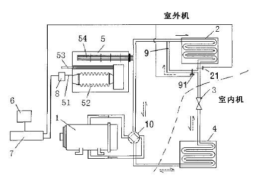 本發(fā)明公開(kāi)了一種制冷、制熱的雙能源燃?xì)鉄岜每照{(diào)系統(tǒng)及運(yùn)行方法,包括熱泵系統(tǒng),還包括一真空鍋爐換熱裝置、一溫度傳感器、以及一切換電路;真空鍋爐換熱裝置設(shè)置在室外,通過(guò)管道連接在熱泵系統(tǒng)的壓縮機(jī)和第一熱交換器之間,與其他部件處于同一循環(huán)系統(tǒng)中;溫度傳感器設(shè)置在室外,該溫度傳感器的輸出端與切換電路的輸入端電連接;切換電路根據(jù)溫度傳感器輸出的溫度信號(hào)控制真空鍋爐換熱裝置和第一熱交換器的交替啟閉。當(dāng)室外溫度降到設(shè)定溫度以下時(shí),真空鍋爐裝置制熱,從而徹底解決了普通熱泵系統(tǒng)在冬天低氣溫的時(shí)候室外機(jī)從空氣中吸熱效率低下、以及結(jié)霜導(dǎo)致系統(tǒng)無(wú)法運(yùn)行的問(wèn)題。具有效率高、制熱效果好和降低用電高峰時(shí)電力系統(tǒng)的壓力的優(yōu)點(diǎn)。 |
