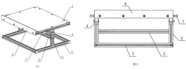 本發(fā)明公開(kāi)了一種用于木工電刨上的門(mén)、窗檔條斜肩加工臺(tái)。座體1是一個(gè)上下底面為等腰直角三角形的三棱柱;座體1其中的一直角邊形成的柱體側(cè)面的兩端端頭分別帶一座夾5,并從此柱體側(cè)面開(kāi)始做一延至斜邊形成的柱體側(cè)面上的鋸槽4;座體1斜邊形成的柱體側(cè)面兩端端頭分別放置一支座3,在兩支座3上放置一靠塊2、且三者之間形成“I”形。采用此裝置可以提高工作效率和加工件的標(biāo)準(zhǔn)程度,且此裝置結(jié)構(gòu)簡(jiǎn)單,成本低廉,使用安全方便。 |
