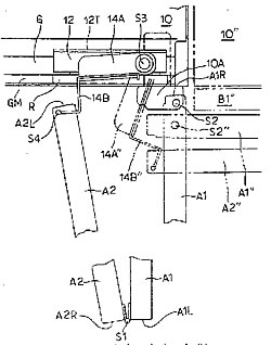 25 | 實(shí)用新型 | 門(mén)的開(kāi)關(guān)機(jī)構(gòu) | 本發(fā)明提供可以把折疊式門(mén)打開(kāi)大于90度角的門(mén)的開(kāi)關(guān)機(jī)構(gòu)。柜體(10)形成的開(kāi)門(mén)部位至少有要開(kāi)關(guān)一部分的相鄰的兩扇門(mén)A1、A2,以上下方向的第1軸S1為中心連結(jié)在一起,并可以相互轉(zhuǎn)動(dòng),一扇門(mén)A1具有以遠(yuǎn)離上述第1軸一側(cè)A1R附近上下方向的第2軸S2為中心與柜體連結(jié),并能相對(duì)柜體轉(zhuǎn)動(dòng)的折疊式門(mén)A,以及沿柜體開(kāi)口部位左右方向移動(dòng)的移動(dòng)件12,以上下方向的第3軸S3為中心與上述移動(dòng)件連結(jié),并能相對(duì)上述移動(dòng)件轉(zhuǎn)動(dòng)的轉(zhuǎn)動(dòng)部件14A、14B。上述折疊式門(mén)的另一扇門(mén)A2以在遠(yuǎn)離上述第1軸一側(cè)A2L附近的第4軸S4為中心,連結(jié)上述轉(zhuǎn)動(dòng)部件,并可以相互轉(zhuǎn)動(dòng)。 |