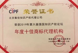 集佳獲2019第六屆強國知識產(chǎn)權(quán)論壇“十佳商標代理機構(gòu)”榮譽稱號