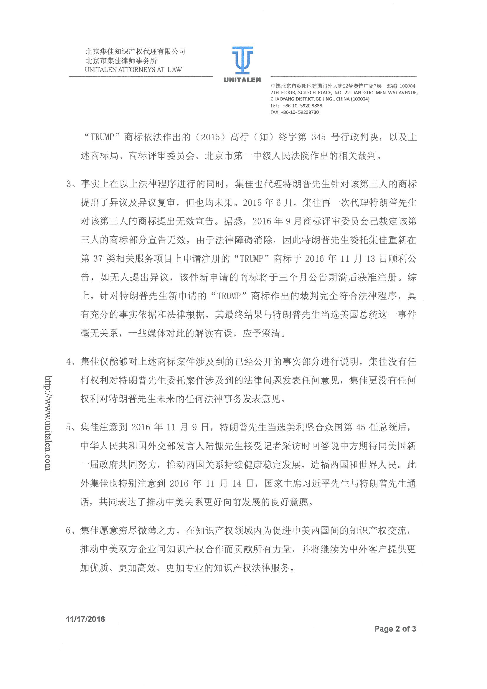 關(guān)于唐納德·特朗普先生委托北京集佳知識(shí)產(chǎn)權(quán)代理有限公司、北京市集佳律師事務(wù)所代理在華商標(biāo)事務(wù)涉及事實(shí)問題的鄭重聲明 .pdf