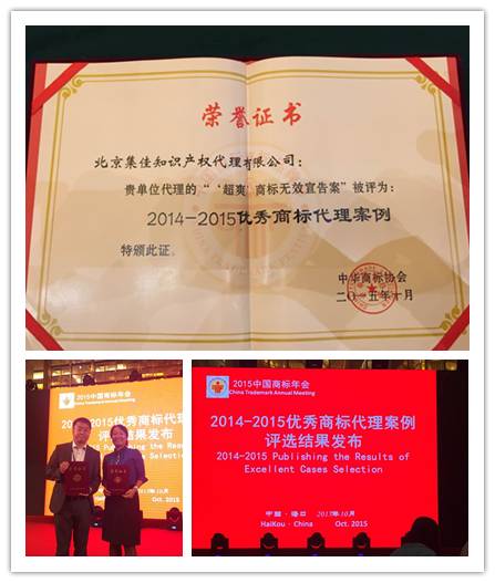 10月18日上午,由中華商標(biāo)協(xié)會(huì)和??谑姓鬓k的2015中國(guó)國(guó)際商標(biāo)品牌節(jié)·商標(biāo)優(yōu)秀案例評(píng)析論壇在海南國(guó)際會(huì)議中心召開(kāi)。集佳代理的“超爽”無(wú)效宣告案件入選中華商標(biāo)協(xié)會(huì)評(píng)選的22件優(yōu)秀商標(biāo)案例,被評(píng)為“2014-2015優(yōu)秀商標(biāo)代理案例”。