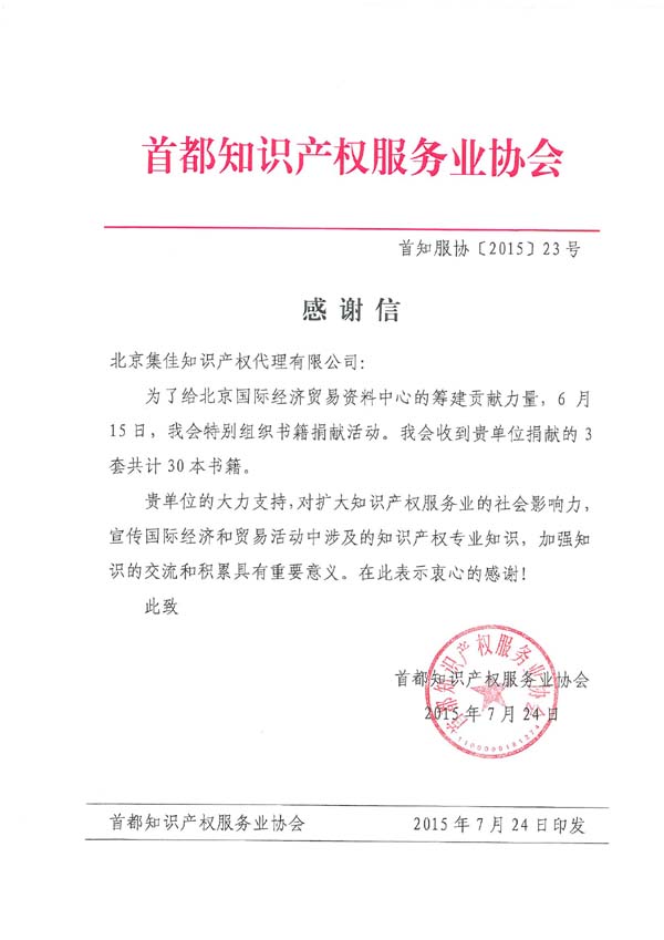 2015年7月24日,首都知識(shí)產(chǎn)權(quán)服務(wù)業(yè)協(xié)會(huì)向集佳發(fā)來感謝信。在其六月份組織的書籍捐獻(xiàn)活動(dòng)中,集佳捐贈(zèng)30本出自集佳專業(yè)人士的系列叢書《知識(shí)產(chǎn)權(quán)戰(zhàn)略與實(shí)務(wù)》,為北京國際經(jīng)濟(jì)貿(mào)易資料中心的籌建貢獻(xiàn)一份力量。