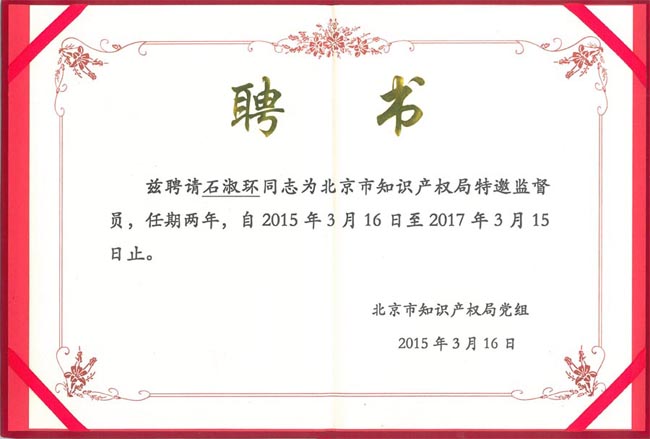 集佳辦公室主任石淑環(huán)受聘為北京市知識產(chǎn)權(quán)局特邀監(jiān)督員