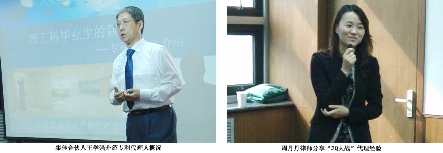 活動中,北京市代理人協(xié)會副會長、集佳合伙人王學(xué)強為同學(xué)們介紹了專利代理人的職業(yè)概況,使大家對知識產(chǎn)權(quán)和專利代理人行業(yè)有了更客觀的了解。知名代理律師周丹丹則與大家分享了“3Q大戰(zhàn)”的代理經(jīng)驗,充分展現(xiàn)了律師的代理風(fēng)采。宣講過程中,大家圍繞專利代理人的職業(yè)規(guī)劃和發(fā)展前景、律師在代理案件過程中總結(jié)的難點、解決方法和思路等問題與兩位專業(yè)人士進行了熱烈討論。