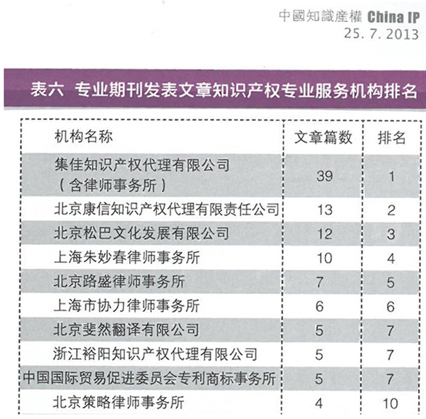近日,《中國知識產(chǎn)權(quán)》雜志聯(lián)合上海知識產(chǎn)權(quán)研究所,發(fā)布了《2012年度我國知識產(chǎn)權(quán)專業(yè)文章統(tǒng)計報告》,在該報告中,集佳以在專業(yè)期刊發(fā)表39篇文章的較大優(yōu)勢,在“2012年度專業(yè)期刊發(fā)表文章知識產(chǎn)權(quán)專業(yè)服務(wù)機構(gòu)排名”中榮登榜首。