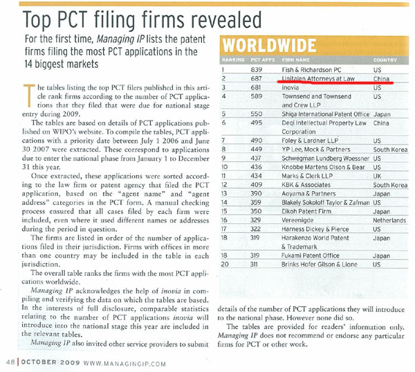 近日,根據(jù)全球權(quán)威知識產(chǎn)權(quán)刊物Managing Intellectual Property (MIP)2009年10月期公布的一份數(shù)據(jù)顯示,全球PCT申請統(tǒng)計中,在申請日(優(yōu)先權(quán)日)介于2006年7月1日至2007年6月30日之間,30個月的絕限落在2009年1月至2009年12月間的已經(jīng)公開的PCT申請中,集佳知識產(chǎn)權(quán)代理有限公司以687件申請在全球代理機(jī)構(gòu)排名中僅次于一家美國事務(wù)所而位列第二,也是中國唯一一家躋身全球前五名的知識產(chǎn)權(quán)服務(wù)機(jī)構(gòu)。
