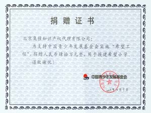 作為目前中國最大的知識產(chǎn)權(quán)服務(wù)機(jī)構(gòu)之一,集佳知識產(chǎn)權(quán)代理有限公司在自身穩(wěn)健發(fā)展的同時,積極承擔(dān)著企業(yè)的社會責(zé)任。自2004年起,集佳與中國青少年發(fā)展基金會合作,積極參與“希望工程”捐建希望小學(xué)活動。截至2009年10月,集佳已捐款一百五十余萬元,援建了彪池村集佳希望小學(xué)、陸廟村集佳希望小學(xué)、韓營村集佳希望小學(xué)、清風(fēng)嶺集佳希望小學(xué)和清泉集佳希望小學(xué),圓了近萬名學(xué)齡兒童的求學(xué)夢想。集佳正在用行動兌現(xiàn)最初的承諾:“每年建一所集佳希望小學(xué)!”