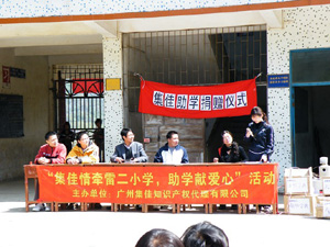 2009-03-17信守著感恩博愛、熱情助人、承擔(dān)社會責(zé)任的信念,廣州集佳知識產(chǎn)權(quán)代理有限公司組織員工和東莞辦事處在2009年3月的一個星期六組織了扶助清新縣石潭鎮(zhèn)雷二小學(xué)的獻愛心活動。