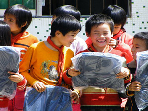 集佳向雷二小學(xué)捐贈 拿到新書包的小學(xué)生