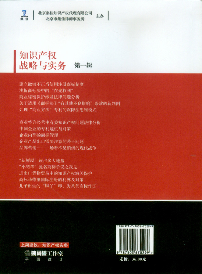 集佳一直倡導(dǎo)在為客戶提供優(yōu)質(zhì)知識(shí)產(chǎn)權(quán)服務(wù)的同時(shí),注重加強(qiáng)在知識(shí)產(chǎn)權(quán)實(shí)務(wù)和理論方面的研究。在長(zhǎng)達(dá)十余年為客戶提供卓越服務(wù)的過(guò)程中,集佳積累了非常豐富的實(shí)踐經(jīng)驗(yàn),并在此基礎(chǔ)上總結(jié)形成了豐富的研究成果。近日,集佳將這些成果進(jìn)行了系統(tǒng)整理,并結(jié)集成書——《知識(shí)產(chǎn)權(quán)戰(zhàn)略與實(shí)務(wù)》(第一輯)。該書由集佳合伙人會(huì)議主席于澤輝主編,已于近日由法律出版社面向全國(guó)正式出版發(fā)行。