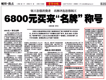2007年4月5日,《京華時報》財經(jīng)焦點整版刊登了新聞:《鍋王忽悠消費者 名牌評選忽悠鍋王 6800元買來“名牌”稱號》,各大媒體紛紛轉(zhuǎn)載報道。集佳律師事務所李永波律師接受了《京華時報》記者的采訪。