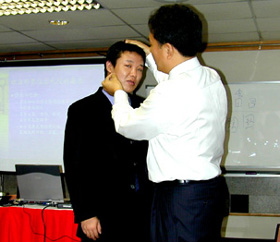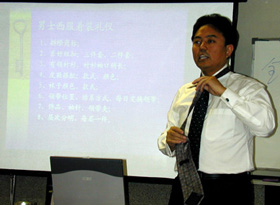 “碰撞精彩生活——集佳職業(yè)形象設(shè)計系列講座(一)”成功舉辦后,受到公司廣大女女性員工的歡迎,規(guī)范了女性在工作中的職業(yè)形象,塑造了職業(yè)女性的獨特魅力。為塑造集佳人整體的良好職業(yè)形象,體現(xiàn)集佳人的專業(yè)化、高素質(zhì),北京集佳于2003年11月15日在賽特廣場二層會議室內(nèi)為男性員工舉辦了“挖掘自我·煥發(fā)魅力·展現(xiàn)風(fēng)采”——集佳職業(yè)形象設(shè)計系列講座(二)。 盡管講座利用的是周六休息時間,但還是得到了大部分男性員工的支持,有近25名員工參加了本次講座。初冬的北京已經(jīng)滲透出些微寒意,但在集佳講座的現(xiàn)場,輕柔的音樂、最新的秋冬男裝展示以及一杯溫?zé)嵯丬?,讓溫暖在會場中四溢開來。 本次講座邀請了外交學(xué)院外事辦公室副主任、國際交流中心主任文泉老師主講,講座主題圍繞男性著裝、配襯及配套物品、個人儀容、接待禮儀、商務(wù)活動中的職業(yè)形象塑造、辦公室禮儀、國際商務(wù)禮儀常識等展開,不僅有系統(tǒng)規(guī)范地理論講授,還結(jié)合了生動的范例和實物,更好的傳達出良好的職業(yè)形象在實際工作中的重要意義和作用。 為了增強講座的針對性,行政部丁雷為大家做了示范,讓我們感受到花幾分鐘來注意一下細節(jié),就會有截然不同的效果。 文泉老師具有豐富的授課經(jīng)驗,曾赴國家電力總公司國際部、中國建材總公司、東方資產(chǎn)管理公司、江西省科協(xié)、建設(shè)部信息中心、浙江省經(jīng)濟學(xué)會、中國普天等單位進行國際商務(wù)禮儀、職業(yè)形象塑造等培訓(xùn),同時,海信集團、廈門國際銀行、德力西集團、重慶電信公司、曲靖卷煙廠等單位的學(xué)員都接受過文老師的公開課培訓(xùn)及企業(yè)內(nèi)訓(xùn)。