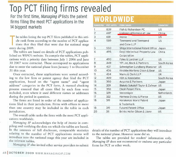 根據(jù)全球權(quán)威知識產(chǎn)權(quán)刊物Managing Intellectual Property (MIP)2009年10月期公布的一份數(shù)據(jù)顯示,全球PCT申請統(tǒng)計中,在申請日(優(yōu)先權(quán)日)介于2006年7月1日至2007年6月30日之間,30個月的絕限落在2009年1月至2009年12月間的已經(jīng)公開的PCT申請中,集佳知識產(chǎn)權(quán)代理有限公司以687件申請?jiān)谌虼頇C(jī)構(gòu)排名中僅次于一家美國事務(wù)所而位列第二,也是中國唯一一家躋身全球前五名的知識產(chǎn)權(quán)服務(wù)機(jī)構(gòu)。