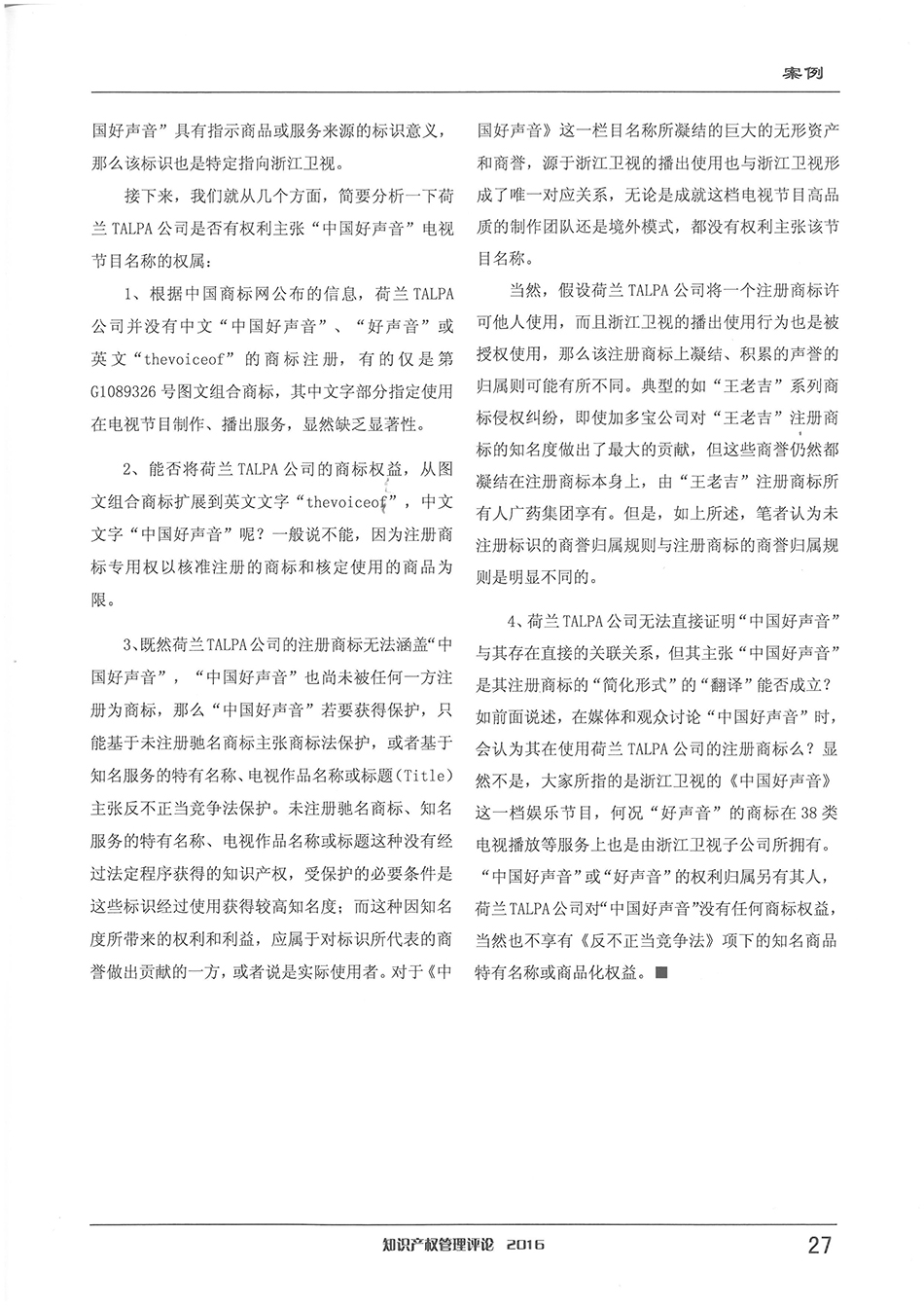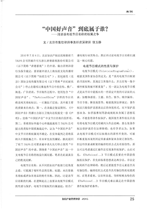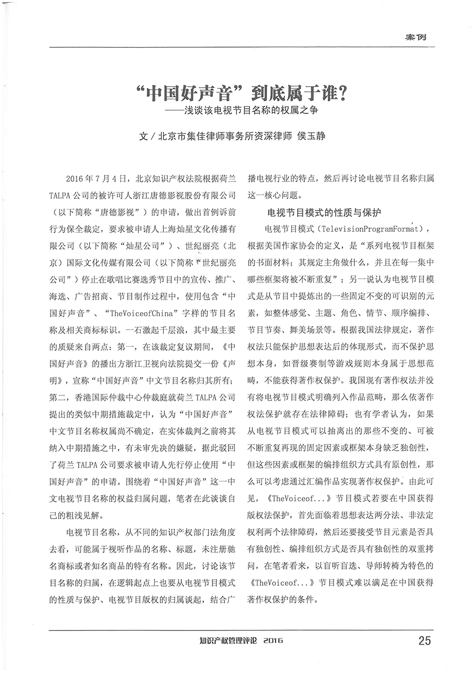 集佳資深律師侯玉靜文章《“中國好聲音”到底屬于誰?——淺談該電視節(jié)目名稱的權屬之爭》在《知識產(chǎn)權管理評論》發(fā)表