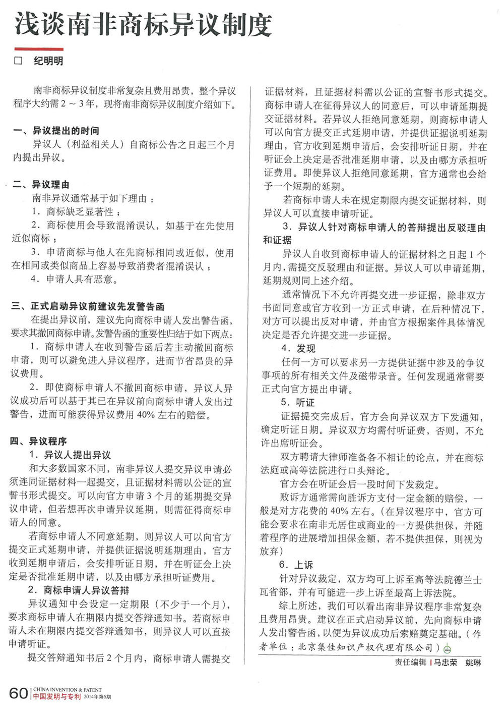 集佳代理人文章《淺談南非商標異議制度》被《中國發(fā)明與專利》發(fā)表