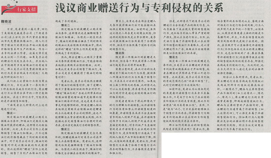 集佳代理人撰文《淺議商業(yè)贈送行為與專利侵權(quán)的關(guān)系》在《中國知識產(chǎn)權(quán)報》發(fā)表