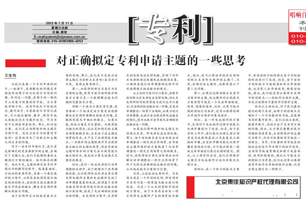 《中國(guó)知識(shí)產(chǎn)權(quán)報(bào)》:對(duì)正確擬定專利申請(qǐng)主題的一些思考