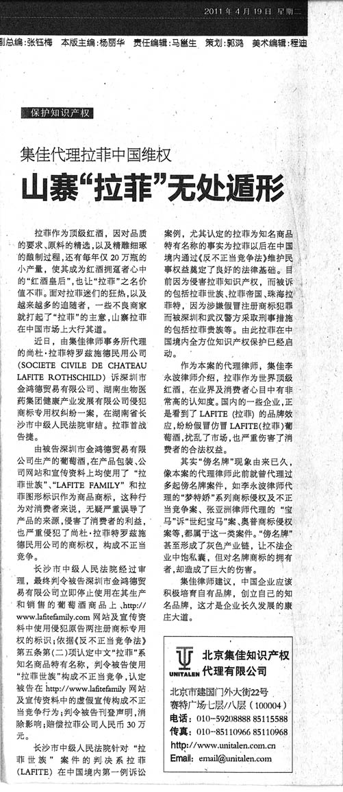 《國際商報(bào)》:集佳代理拉菲中國維權(quán)