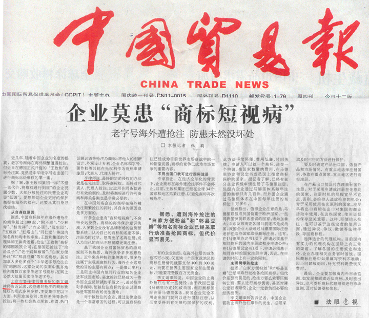 《中國貿(mào)易報》采訪:《企業(yè)莫患“商標短視病” 老字號海外遭搶注 防患未然沒壞處》