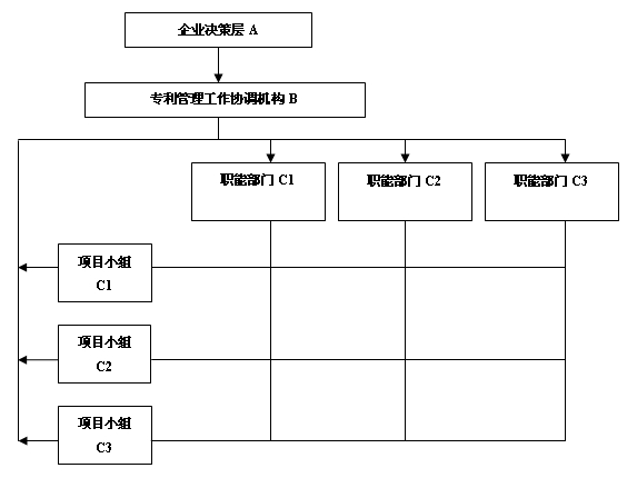 隨著企業(yè)在采用直線式組織架構(gòu)體系過程中專利管理方面暴露出的問題,比如侵權(quán)訴訟的發(fā)生、海關(guān)出口貨物的被查扣、重復(fù)研發(fā)造成的資金浪費(fèi)等,中等規(guī)模的企業(yè)開始試探設(shè)立相對交叉的職能式專利管理組織架構(gòu)。