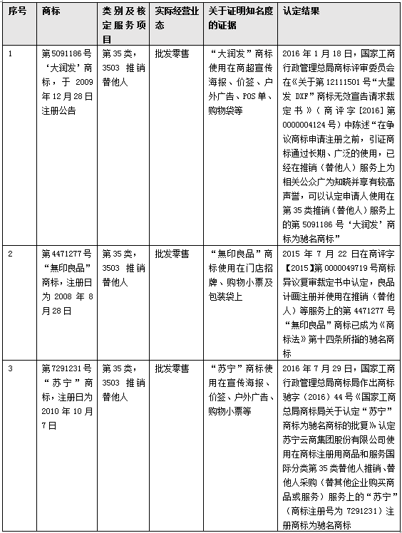 另外,即使在商標(biāo)授權(quán)確權(quán)程序中,對(duì)一些案件的裁判結(jié)果與固有的“批發(fā)零售和推銷替他人不相同不類似”認(rèn)知也相左,以下列舉“大潤發(fā)”、“無印良品”和“蘇寧”三個(gè)行政認(rèn)定馳名商標(biāo)案件為例予以說明?!按鬂櫚l(fā)”是知名的連鎖超市品牌,其權(quán)利人在2009年12月在第35類第3503類似群“推銷(替他人)”服務(wù)項(xiàng)目上注冊(cè)第5091186號(hào)“大潤發(fā)”商標(biāo),后在批發(fā)零售業(yè)態(tài)上進(jìn)行了大量使用,2015年基于在批發(fā)零售上使用形成的知名度,第5091186號(hào)“大潤發(fā)”商標(biāo)被認(rèn)定為上海市著名商標(biāo),2016年該商標(biāo)被原國家工商總局商評(píng)委認(rèn)定為馳名商標(biāo)。除此之外,類似情形的還有無印良品和蘇寧兩案。