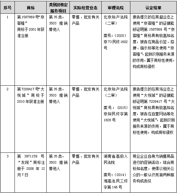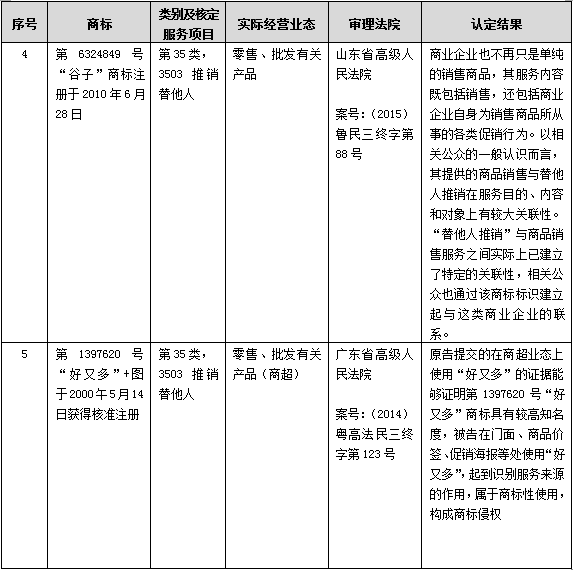 但對(duì)于熟悉商標(biāo)授權(quán)確權(quán)程序和商標(biāo)民事侵權(quán)訴訟的代理人而言,一個(gè)耐人尋味的現(xiàn)象是2011年至今全國各地法院審理的商標(biāo)民事侵權(quán)訴訟認(rèn)定結(jié)果卻與上述系列商標(biāo)行政訴訟認(rèn)定結(jié)果大相徑庭,例如:四川高院2011年和廣東高院2014年判決的好又多案【16】,北京知識(shí)產(chǎn)權(quán)法院2015年和2020年判決的大悅城和京客隆案【17】,湖南高院判決的友阿案【18】,山東高院判決的谷子案【19】等均無一例外認(rèn)為批發(fā)零售與推銷替他人構(gòu)成類似服務(wù)。對(duì)于這種商標(biāo)民事侵權(quán)與商標(biāo)授權(quán)確權(quán)兩程序中出現(xiàn)的差異,作為審理商標(biāo)授權(quán)確權(quán)行政訴訟的二審法院,北京高院知識(shí)產(chǎn)權(quán)庭在2017年《商標(biāo)授權(quán)確權(quán)行政案件相關(guān)疑難問題的調(diào)研報(bào)告(三)》【20】一文中給予了回應(yīng),其認(rèn)為應(yīng)當(dāng)區(qū)分在商標(biāo)民事糾紛中對(duì)商標(biāo)專用權(quán)的保護(hù)和在商標(biāo)權(quán)撤銷復(fù)審行政糾紛中對(duì)商標(biāo)專用權(quán)維持有效制度的差異,在商標(biāo)民事侵權(quán)案件中,對(duì)商標(biāo)專用權(quán)的保護(hù)體現(xiàn)為“禁用權(quán)”所限定的范圍,其是以法律所規(guī)定的侵害他人注冊(cè)商標(biāo)專用權(quán)為基礎(chǔ),以是否會(huì)造成商品的來源混淆為落腳點(diǎn),而發(fā)生混淆的范圍不僅及于注冊(cè)商標(biāo)所核定使用的相同商品或服務(wù),也包括了類似商品或服務(wù),而對(duì)類似商品或服務(wù)的判斷,是從功能、用途、生產(chǎn)部門、銷售渠道、消費(fèi)群體、服務(wù)對(duì)象、內(nèi)容、方式等方面進(jìn)行的認(rèn)知。故商標(biāo)禁用權(quán)的范圍顯然超過了專用權(quán)。