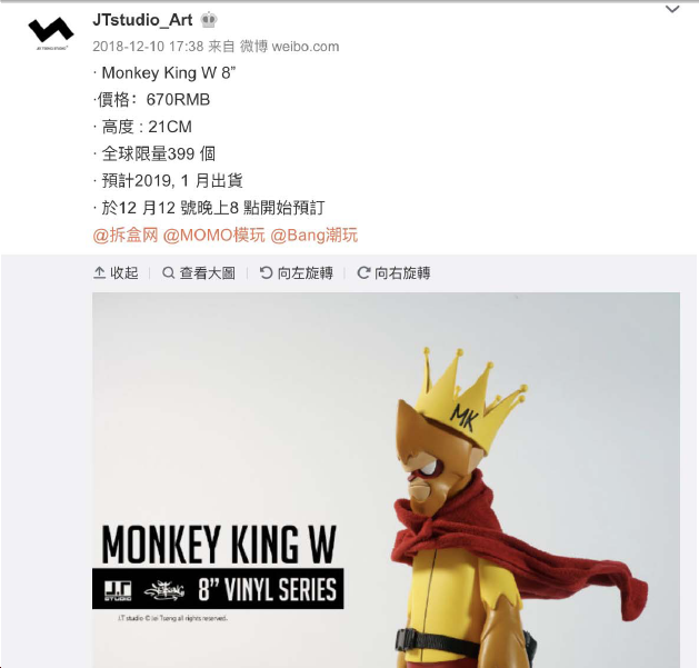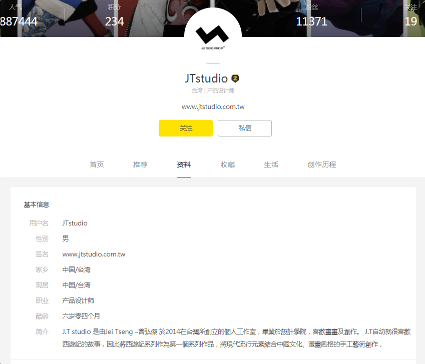異議人站酷ZCOOL網(wǎng)站的個(gè)人主頁(yè)(https://www.zcool.com.cn/u/2732656/profile#tab_anchor)顯示,J.T studio是由異議人曾弘杰(英文名Jei Tseng)2014年在中國(guó)臺(tái)灣所創(chuàng)立的個(gè)人工作室,曾弘杰畢業(yè)于設(shè)計(jì)學(xué)院,喜歡畫(huà)畫(huà)及創(chuàng)作,自幼就很喜歡西游記的故事,因此將西游記系列作為第一個(gè)系列作品,將現(xiàn)代流行元素結(jié)合中國(guó)文化、漫畫(huà)風(fēng)格的手工藝術(shù)創(chuàng)作。異議人在站酷ZCOOL網(wǎng)站擁有11371位粉絲,人氣值高達(dá)1887444。