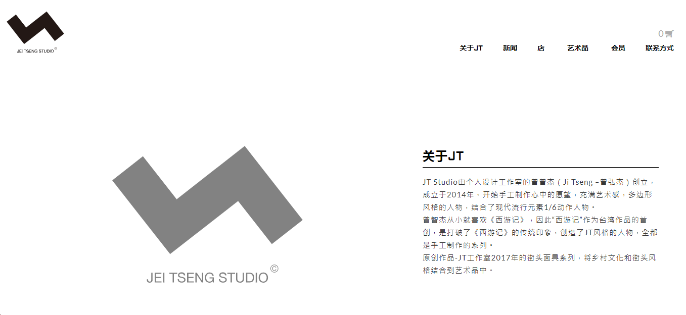 站酷ZCOOL網(wǎng)站中作者主頁(yè)顯示個(gè)人工作室官方網(wǎng)站為www.jtstudio.com.tw,異議人隨案提供了異議人個(gè)人工作室官網(wǎng)打印件,官網(wǎng)首頁(yè)顯示如下信息:JT Studio由個(gè)人設(shè)計(jì)工作室的曾弘杰(Jei Tseng 曾弘杰)創(chuàng)立,成立于2014年。開(kāi)始手工制作心中的愿望,充滿藝術(shù)感,多邊形風(fēng)格的人物,結(jié)合了現(xiàn)代流行元素1/6動(dòng)作人物。曾弘杰從小就喜歡《西游記》,因此“西游記”作為臺(tái)灣作品的首創(chuàng),是打破了《西游記》的傳統(tǒng)印象,創(chuàng)造了JT風(fēng)格的人物,全都是手工制作的系列。原創(chuàng)作品-JT工作室2017年的街頭面具系列,將鄉(xiāng)村文化和街頭風(fēng)格結(jié)合到藝術(shù)品中。