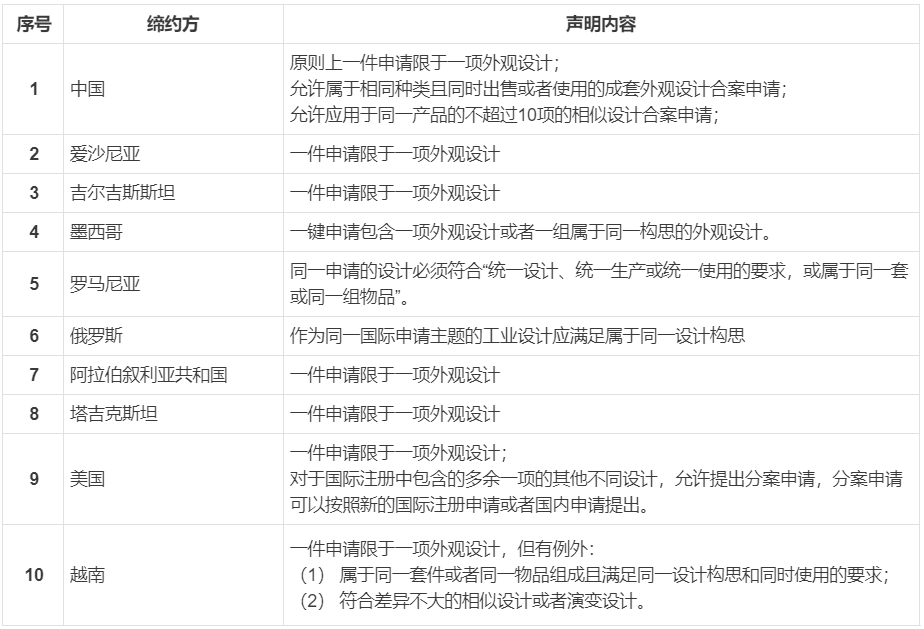 通過(guò)海牙體系提交國(guó)際注冊(cè)申請(qǐng),一件申請(qǐng)中最多可以包含不超過(guò)100項(xiàng)外觀設(shè)計(jì),前提是這些外觀設(shè)計(jì)同屬于同一大類(lèi)(洛迦諾分類(lèi))。不過(guò),并不是所有締約方的法律都放開(kāi)了合案申請(qǐng)的外觀設(shè)計(jì)的限制。如果根據(jù)其國(guó)內(nèi)法律規(guī)定,不允許就不同外觀設(shè)計(jì)進(jìn)行合案或者對(duì)合案數(shù)量有所限制,則該締約方必須提前向國(guó)際局提出聲明,下列為目前作出聲明的締約方及其聲明的內(nèi)容: