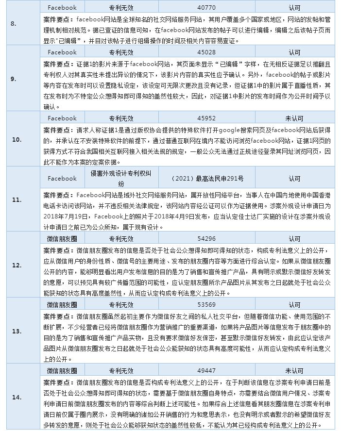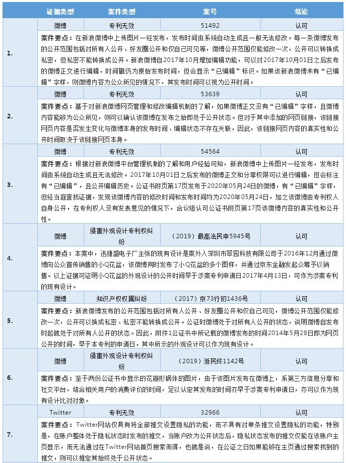 社交網(wǎng)絡(luò)類平臺(tái)及相關(guān)軟件應(yīng)用因其用戶交互模式的易用性及便捷性擁有數(shù)量極為龐大的用戶,由此產(chǎn)生的海量信息中往往蘊(yùn)含可用作認(rèn)定為現(xiàn)有技術(shù)的證據(jù)。常見(jiàn)的社交網(wǎng)絡(luò)平臺(tái)包括新浪微博、微信公眾平臺(tái)、微信朋友圈、Facebook、Twitter等,而不同類型的社交平臺(tái)其隱私功能,已發(fā)布信息修改功能均有所不同。比如新浪微博用戶在發(fā)表微博時(shí),存在私密權(quán)限和公開(kāi)權(quán)限的設(shè)置,微博公開(kāi)范圍可以從公開(kāi)轉(zhuǎn)成私密,但私密不能轉(zhuǎn)成公開(kāi)。而微信朋友圈的公開(kāi)范圍可以在公開(kāi)與私密間來(lái)回切換且不會(huì)影響發(fā)布時(shí)間,也不會(huì)留下編輯痕跡。因此,在實(shí)踐中認(rèn)定此類社交網(wǎng)絡(luò)類證據(jù)是否構(gòu)成專利法意義上的公開(kāi)時(shí),主要的考量的重點(diǎn)為公開(kāi)性及公開(kāi)時(shí)間。下表是認(rèn)定社交網(wǎng)絡(luò)平臺(tái)類網(wǎng)絡(luò)證據(jù)的案例梳理。