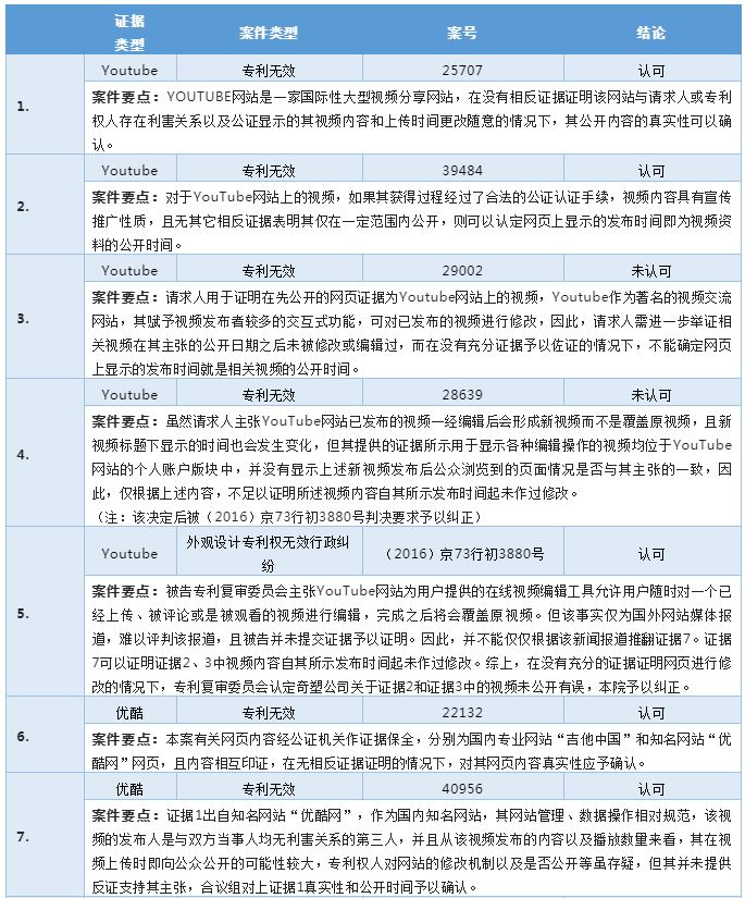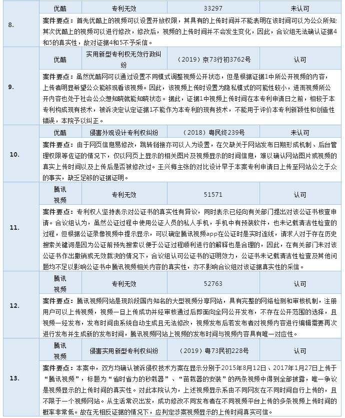 相較于社交平臺(tái)類網(wǎng)絡(luò)證據(jù),視頻流媒體類網(wǎng)絡(luò)證據(jù)因其獨(dú)特的形式往往蘊(yùn)含更為豐富的有效信息,并且能夠讓人更為直觀的理解目標(biāo)信息。對(duì)于視頻流媒體類網(wǎng)絡(luò)證據(jù)的認(rèn)定規(guī)則與社交平臺(tái)類網(wǎng)絡(luò)證據(jù)較為相似,考量的重點(diǎn)不外乎真實(shí)性,公開(kāi)性以及公開(kāi)時(shí)間,但因視頻流媒體平臺(tái)的相關(guān)隱私權(quán)限規(guī)則及修改規(guī)則較為隱蔽,需要針對(duì)平臺(tái)規(guī)則進(jìn)行詳細(xì)解釋說(shuō)明。同時(shí)應(yīng)當(dāng)注意的是,在實(shí)踐中由于部分企業(yè)存在產(chǎn)品宣傳先行,專利申請(qǐng)滯后的情況,相關(guān)視頻的發(fā)布者往往是專利權(quán)人或其關(guān)聯(lián)主體。在此種情形下,應(yīng)當(dāng)著重審核發(fā)布主體的身份用以輔助參考證據(jù)的真實(shí)性及公開(kāi)性。下表是認(rèn)定視頻流媒體類網(wǎng)絡(luò)證據(jù)的案例梳理。