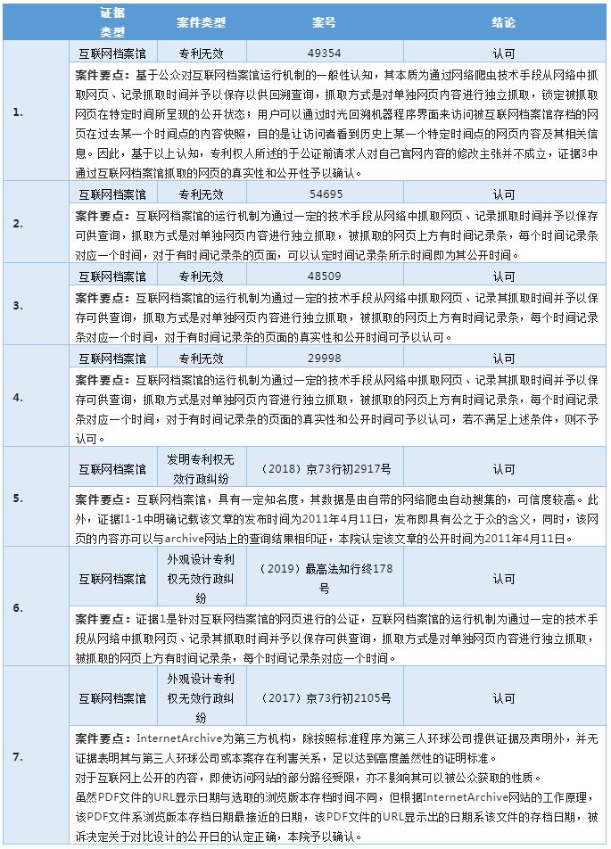 互聯(lián)網(wǎng)檔案館(Internet Archive)是一家以普及利用所有知識(shí)為目標(biāo)的非營(yíng)利性數(shù)字圖書(shū)館?;ヂ?lián)網(wǎng)檔案館提供永久存儲(chǔ)和免費(fèi)的公共訪問(wèn)的數(shù)字化材料信息集合,讓公眾上傳和下載數(shù)字材料到其數(shù)據(jù)集群,但其大部分?jǐn)?shù)據(jù)是靠其網(wǎng)絡(luò)爬蟲(chóng)自動(dòng)收集。互聯(lián)網(wǎng)檔案館的Web歸檔文件系統(tǒng)Wayback機(jī)器包含了超過(guò)1500億以上的網(wǎng)頁(yè)存檔。有別于其他類型的網(wǎng)絡(luò)證據(jù),互聯(lián)網(wǎng)檔案館較為特殊,其本質(zhì)上屬于可溯源的歷史上曾存在的網(wǎng)頁(yè)資源記錄,在抓取網(wǎng)頁(yè)信息時(shí)即可證明該網(wǎng)頁(yè)相關(guān)信息處于公開(kāi)狀態(tài),并且互聯(lián)網(wǎng)檔案館會(huì)記錄抓取信息的時(shí)間。下表是認(rèn)定互聯(lián)網(wǎng)檔案館網(wǎng)絡(luò)證據(jù)的案例梳理。