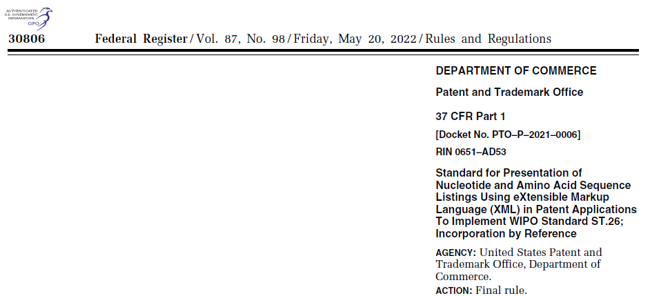2022年5月20日,美國專利商標(biāo)局(USPTO)發(fā)布了一項(xiàng)最終規(guī)則,對2022年7月1日或之后向USPTO提交的申請中的核苷酸和氨基酸序列表(Sequence Listing)實(shí)施 WIPO ST.26標(biāo)準(zhǔn),以及對其他實(shí)施細(xì)則進(jìn)行相應(yīng)修訂(參見聯(lián)邦公報(bào)30806)。該最終規(guī)則基于并明確納入WIPO ST.26標(biāo)準(zhǔn)的相關(guān)部分,創(chuàng)建了新規(guī)則,即新的37 CFR 1.831-1.835。此外,37 CFR 1.821-1.834通過引用特別納入了WIPO標(biāo)準(zhǔn)ST.26的某些規(guī)定。