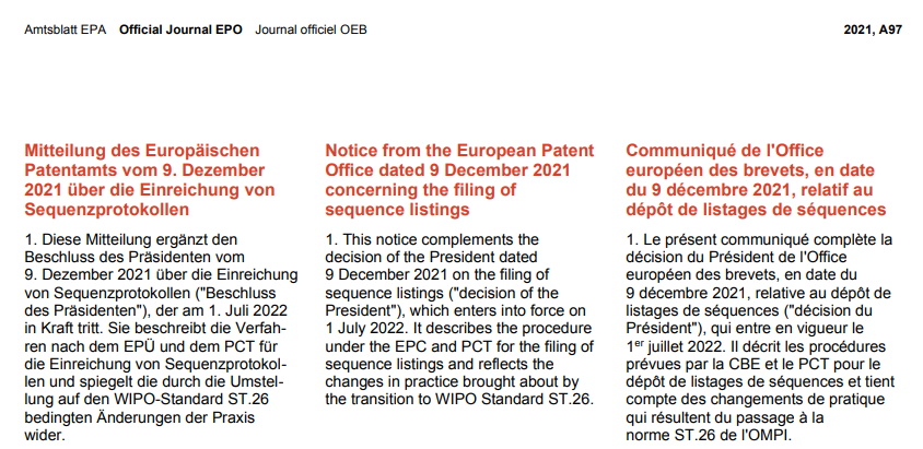 歐洲專利局(EPO)也在2021年12月09日進(jìn)行了公告,要求自2022年7月1日起向EPO提交的國家專利申請和PCT國際申請的序列表電子文件應(yīng)符合WIPO ST.26標(biāo)準(zhǔn)要求。申請日在2022年7月1日之前的申請仍需采用WIPO ST.25標(biāo)準(zhǔn)。