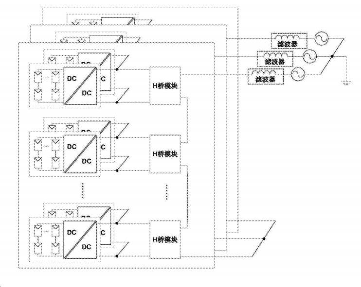 1、一種中高壓光伏發(fā)電系統(tǒng),其特征在于,包括三相濾波器和三個(gè)分別通過所述三相濾波器以星形或三角形接法實(shí)現(xiàn)連接的相電路,所述相電路中包括一個(gè)或者兩個(gè)串聯(lián)的橋臂,所述橋臂包括:至少一個(gè)級(jí)聯(lián)模塊、至少一個(gè)光伏組串和至少一個(gè)絕緣子,所述光伏組串包括多個(gè)光伏組件;所述橋臂中:
