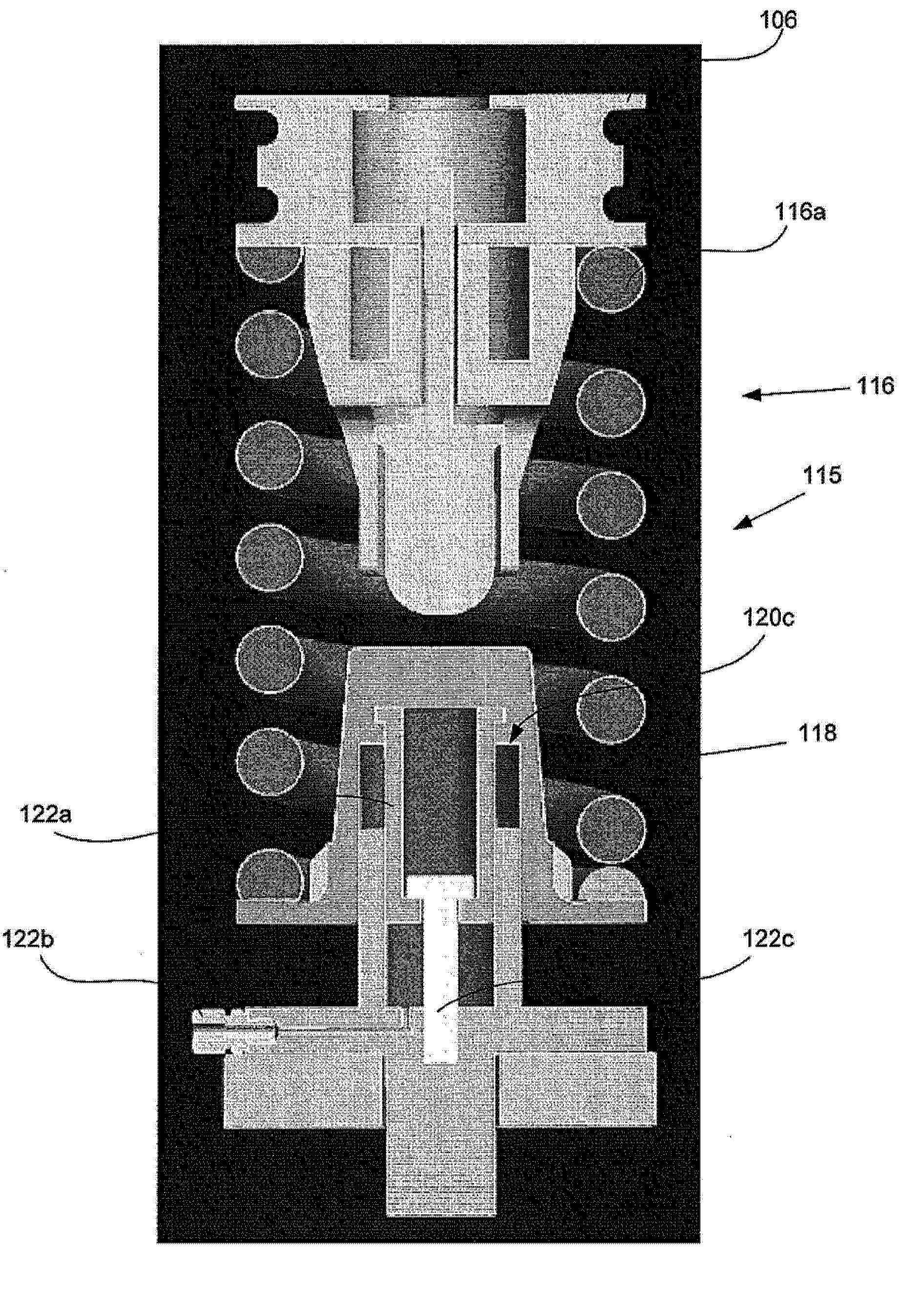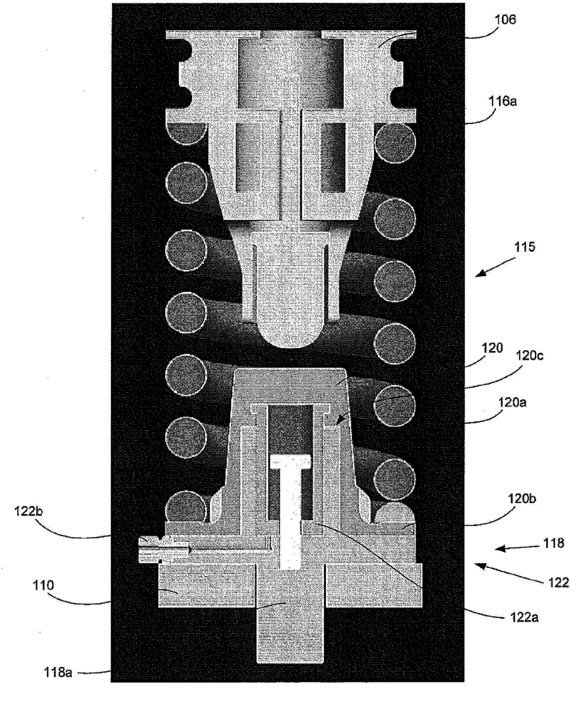 對比文件1公開了一種調(diào)平懸掛115,其包括與SML118接合的彈簧116a,其中彈簧116a的上表面與上部結(jié)構(gòu)106(對應(yīng)于本申請中的廂體)接合,而SMLS的下端118a與轉(zhuǎn)向架110接合。此外,SMLS118包括彈簧支架(SM)120和活塞組件122。SM 120包括定位在螺旋彈簧116a內(nèi)的空心缸筒120a。