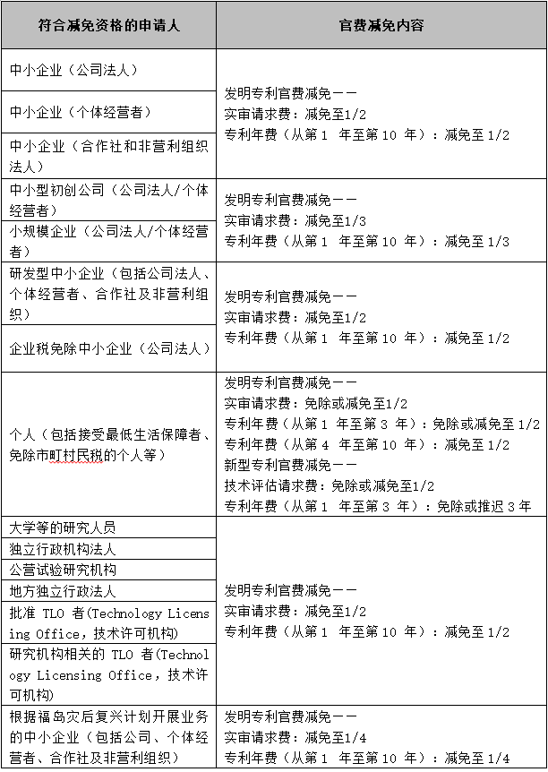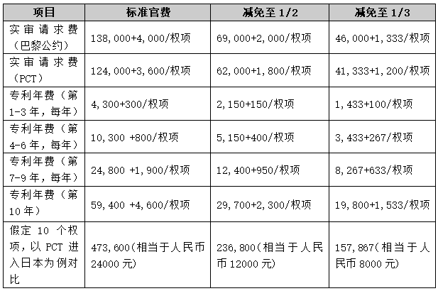 對(duì)于在2019年4月1日之后提出實(shí)審請(qǐng)求的日本發(fā)明專(zhuān)利申請(qǐng),其實(shí)審請(qǐng)求費(fèi)和專(zhuān)利年費(fèi)將按照下表內(nèi)容進(jìn)行減免: