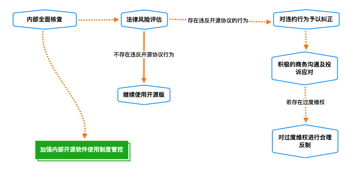 企業(yè)法務部門與技術部門應盡快協(xié)同進行內(nèi)部核查,排查公司對Qt開源軟件的使用情況、對應的開源協(xié)議、是否遵循了開源義務、是否購買過商業(yè)授權、軟件使用量等。如果無法確定涉及的開源軟件及相應的開源義務遵守情況,建議找專業(yè)外部律師團隊進行咨詢。如果確實存在違約行為,則盡快予以糾正。