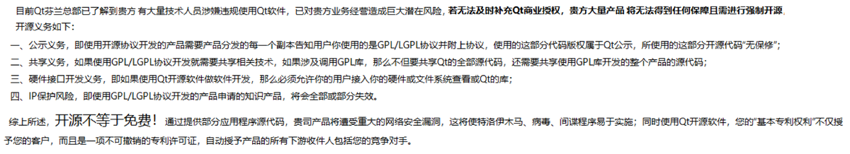 在處理Qt開源軟件合規(guī)糾紛的案件中,筆者發(fā)現(xiàn),部分維權代理機構在沒有任何侵權、違約實證的情況下,僅僅依據(jù)企業(yè)使用了Qt軟件(例如招聘信息中要求應聘者熟練使用Qt,或開發(fā)人員通過工作郵箱注冊、登錄Qt網(wǎng)站的記錄等),武斷地推斷企業(yè)必然違反了開源協(xié)議義務。也有部分維權代理機構自身對開源協(xié)議缺乏了解,只是套用一些模板,對于具體應當遵循何種開源協(xié)議義務、究竟違反了哪條開源協(xié)議條款語焉不詳,往往還會刻意、過度夸大侵權/違約后果。當維權代理機構向產(chǎn)品的終端用戶、上下游合作商、投資人、競爭對手等進行無理由、無根據(jù)進行投訴、警告,給企業(yè)造成商業(yè)機會損害或商譽損失,涉嫌商業(yè)詆毀或者其他不正當競爭行為時,建議企業(yè)及時固定相關證據(jù),進行合理的法律手段反制。