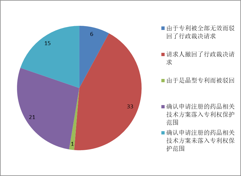 這里統(tǒng)計的僅是做出了確認申請注冊的藥品相關(guān)技術(shù)方案是否落入專利權(quán)保護范圍結(jié)論的裁決,其他案件無法統(tǒng)計。