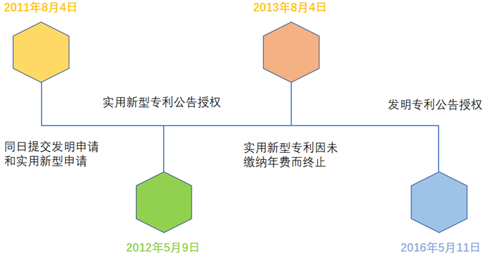 為了使得本案的時間脈絡一目了然,筆者根據(jù)涉案發(fā)明專利和與其同日提交的實用新型專利的重要時間節(jié)點繪制了以下時間軸: