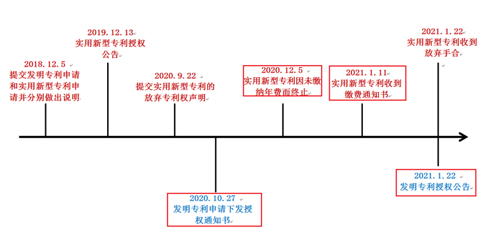 在實踐中,最常見的誤區(qū)之一就是:已收到了發(fā)明專利的授權通知書并且先前已針對實用新型專利提交了放棄聲明,因此無需再維持實用新型。下圖給出了一個非常典型的此類誤區(qū)的案例。