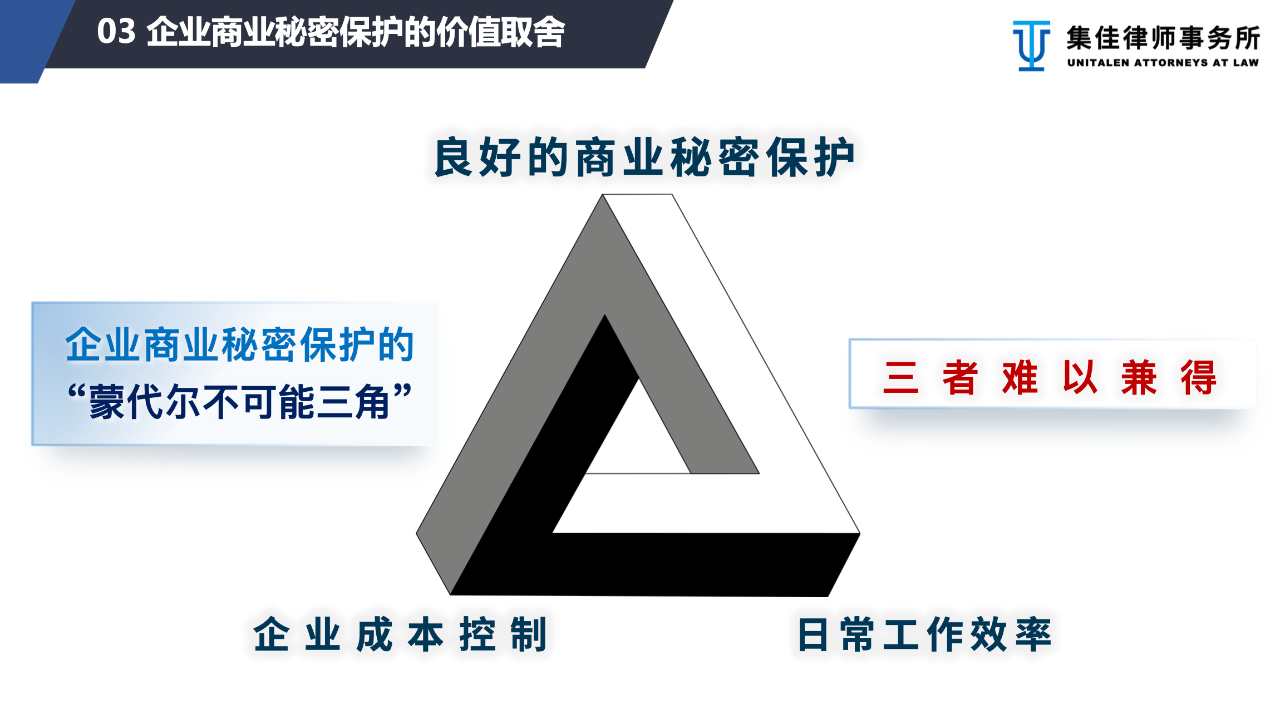 蒙代爾不可能三角又稱三元悖論,通常應(yīng)用于宏觀經(jīng)濟(jì)學(xué),其本質(zhì)是指基于特定的情形下,三種不同位面的價值難以同時實現(xiàn),最多只能同時滿足兩個目標(biāo),而放棄另外一個目標(biāo)?!?9】在企業(yè)商業(yè)秘密保護(hù)中,同樣會面臨著三元悖論的局面,即“良好的商業(yè)秘密保護(hù)”,“企業(yè)成本控制”及“日常工作效率”三者之間難以兼得。例如,在基于優(yōu)先保護(hù)企業(yè)商業(yè)秘密,同時兼顧企業(yè)成本的基礎(chǔ)之下所采取的保密措施,對企業(yè)日常運營的工作效率必然會有一定程度的影響。企業(yè)所采取常見的措施包括限制個人電腦的使用、禁用通訊軟件及設(shè)備的使用、涉密材料的接觸及借閱等需多級審批、員工離職調(diào)崗的脫密流程等。而為實現(xiàn)相同等級商密保護(hù)的基礎(chǔ)之下,降低運營行政成本提升工作效率,則勢必需要應(yīng)用技術(shù)監(jiān)管手段及管理體系,比如信息安全設(shè)備及配套軟件,防數(shù)據(jù)泄漏軟件,區(qū)域監(jiān)控設(shè)備等,這無疑亦會增加企業(yè)運營成本。