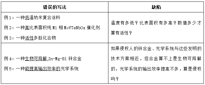 下表的示例使用了相對(duì)關(guān)系的詞語或該發(fā)明的技術(shù)效果來修飾權(quán)利要求的主題。這些修飾語讓主題讀起來更生動(dòng),突出了產(chǎn)品在技術(shù)效果方面的優(yōu)點(diǎn),作為論文的題目或技術(shù)宣傳不錯(cuò),但是,基于下表中所述的“缺陷”,這些用語在權(quán)利要求中是多余的,可能導(dǎo)致權(quán)利要求的范圍不清楚甚至縮小,甚至給侵權(quán)者提供了有機(jī)可乘的漏洞。