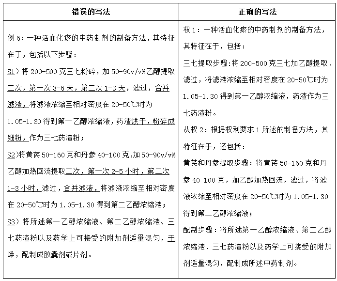 此外,撰寫人應(yīng)知悉,獨(dú)權(quán)的技術(shù)特征數(shù)量越多,保護(hù)對(duì)象的范圍越小。例如,“一種桌子,其特征在于,具有4條腿?!保摍?quán)利要求告訴公眾4條腿的是本發(fā)明的桌子,1~3條腿或5條腿以上的都不是本發(fā)明的桌子;如果寫成“一種桌子,其特征在于,具有4條腿且具有圓形桌面。”,則進(jìn)一步限定了4條腿且圓形桌面的才是本發(fā)明的桌子,將桌面是方形等非圓形形狀的排除到了本發(fā)明的范圍之外。所以,要精剪獨(dú)權(quán)的技術(shù)特征以構(gòu)建更寬的保護(hù)范圍,細(xì)節(jié)特征可寫入從權(quán)以構(gòu)建中范圍至窄范圍的退守性權(quán)利要求。例如,對(duì)發(fā)明點(diǎn)是將三七藥渣粉作為藥物活性組分的例6的發(fā)明而言,可爭取的最大保護(hù)范圍是僅將步驟1寫入獨(dú)權(quán)1,其他步驟寫入從權(quán)。