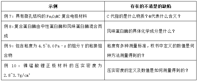 下表示例包含的符號(hào)、數(shù)值、商品名,在說明書中沒有解釋說明或具體示例時(shí)均有可能被審查員質(zhì)疑權(quán)利要求不清楚。